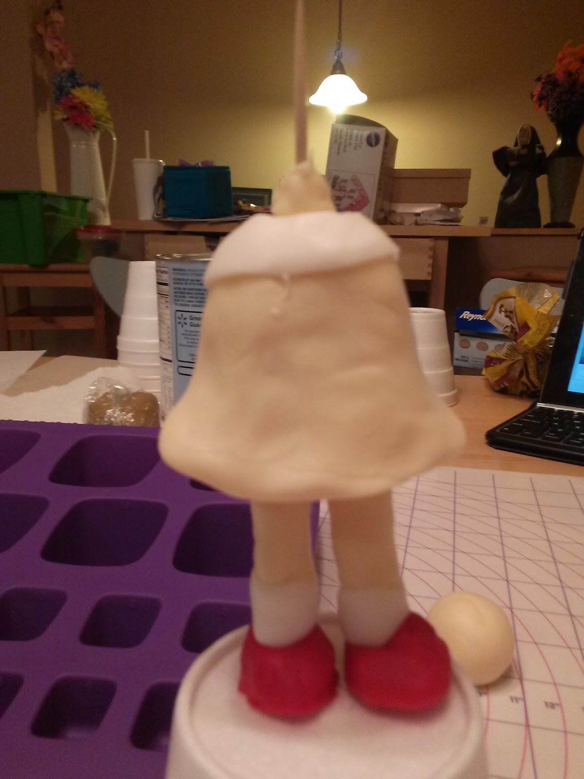 I started with the body and legs. I made a fleshy "body" and added it to the legs, with ruby slippers on the bottom of the legs. I added a white color and white socks. You can kind of see the neck on there as well.